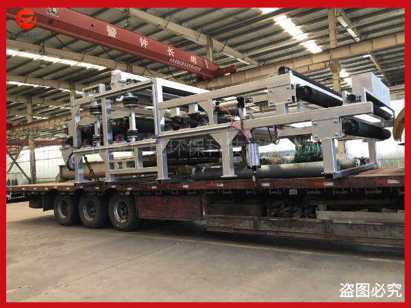 在重力的作用下自由水透過濾網背面而滲出分離,形成不流動狀態的泥漿,達到壓榨脫水區實施較大壓力條件,然后隨著網帶的移動而夾持在上下兩條網帶之間,經過具有可調張緊力的過濾帶及直徑逐漸遞減的轉輥和對壓輥,實施連續增加的緩慢的對輥擠壓力、剪切力作用。